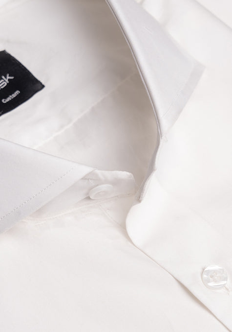 This Egyptian white poplin shirt, crafted from 100% Egyptian cotton with a 60's thread count, is the epitome of elegance and modern style. The lightweight fabric offers a fine, smooth texture with a mild gloss, adding a refined sheen to its classic white design. Featuring a bold cut-away extreme collar, this shirt presents a contemporary take on formal wear, perfect for showcasing a stylish tie or a confident open-collar look. The absence of a placket contributes to its sleek, minimalist appearance, while the beveled cuffs add a subtle, distinguished detail. This shirt is ideal for formal occasions or professional settings, where sophistication and comfort are equally important.