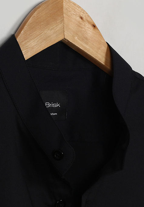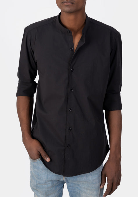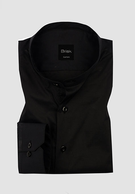 - The Black Stretch Band Collar Shirt is a sleek and contemporary twist on classic style, offering both comfort and modern flair. The band collar gives it a sharp, minimalist aesthetic, eliminating the need for a traditional collar while still maintaining a refined, structured look. Made from a stretch fabric blend, this shirt provides a smooth, form-fitting silhouette that moves with you, ensuring comfort and flexibility throughout the day.