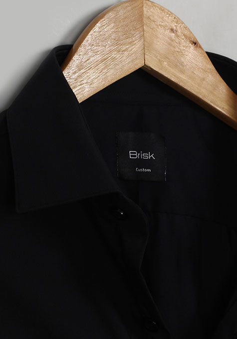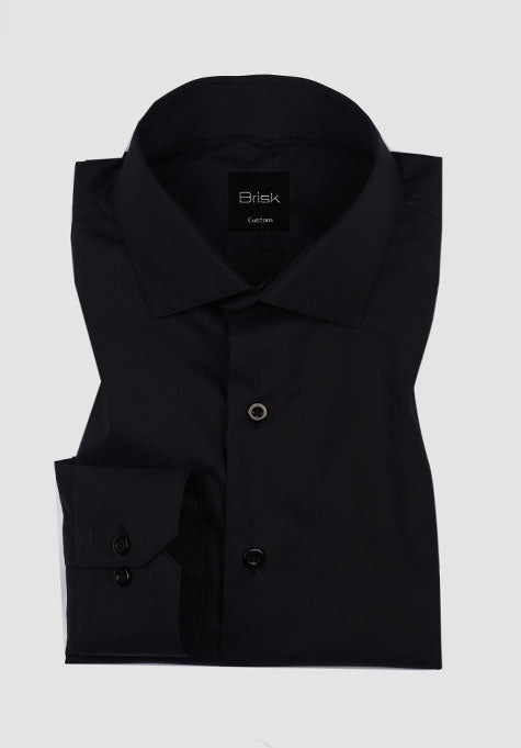 Black stretch shirt featuring a button-down collar fused with soft interlining for a sharp, structured look. It includes a placket and reversible beveled cuffs for added versatility. Made from 90% cotton 8% Nylon 2% Elastane, the fabric is smooth, stretchy, medium-weight, and crisp, offering both breathability and a clean, polished appearance throughout the day. This shirt combines durability and elegance, making it perfect for professional or formal settings.
