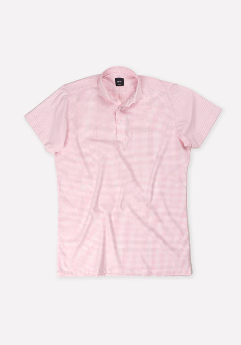 The Pink Mini Gingham Performance Stretch Half Sleeves Shirt is a stylish and functional addition to your activewear collection. Made from a lightweight blend of 91% nylon and 9% spandex, this shirt offers a fine, smooth texture that is both soft against the skin and highly stretchy, providing freedom of movement for various activities. The cut-away extreme collar adds a modern touch, while the placket design enhances its classic appeal. The half sleeves offer added breathability, making this shirt perfect for warmer weather or layering.